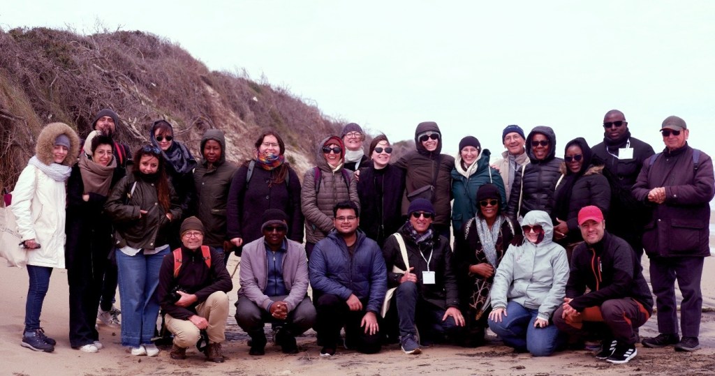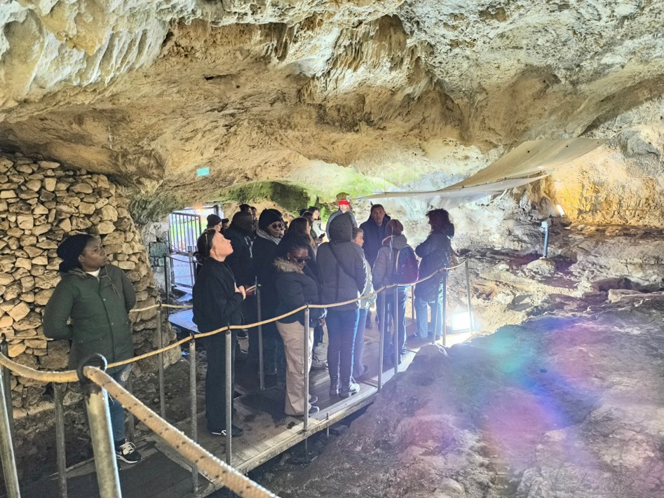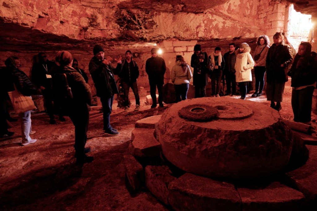 On Monday morning, everyone got their nametags and even a nice tote bag! Next to us DCs, our supervisors, project coordinators, and the local organizing team were present. The official meeting started with a welcome speech by the hosts, followed by a couple of lectures for Workshop 1, “Cultural Landscapes, Modelling, Land Use, Long-term Ecology & the Future”, in which the invited local speakers also gave us insights into the southern Italian context. In the afternoon, the first part of our 2-day field trip through the region of Apulia started: we explored different parts of the coast, defying the untypically cold and windy weather and discussing the karstic landscape with its anthropogenically altered vegetation. Our next destination was the ancient city of Castro, where we visited the remains of a Greek temple of Athena and the Roman city walls. The field trip continued on Tuesday with a visit to a protected natural area at the coast, where we walked along the dunes – green on the landside and alarmingly eroded on the seaside—with a beach full of waste washed ashore: “paleoplastics”, our guide called it, because some objects are decades old and neither in use nor in production anymore. The freshwater lakes just behind the dunes, we are told, were historically important for catching eels. Another vital resource of the region, of course, are olive groves. We therefore visited the “Millenary Olive Trees Park” to learn about historical oil extraction methods and landscape management. Our last destination, in the evening, was a cave with a Paleolithic burial and a Christian fresco from the 15th/16th century.