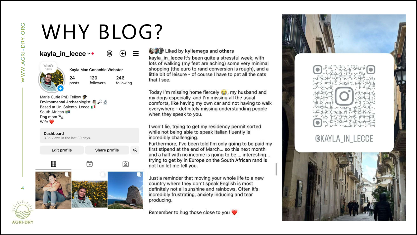 “I was invited to talk about how I use my Instagram blog (@kayla_in_lecce) to share my PhD journey and raise awareness about the AGRI-DRY project.”